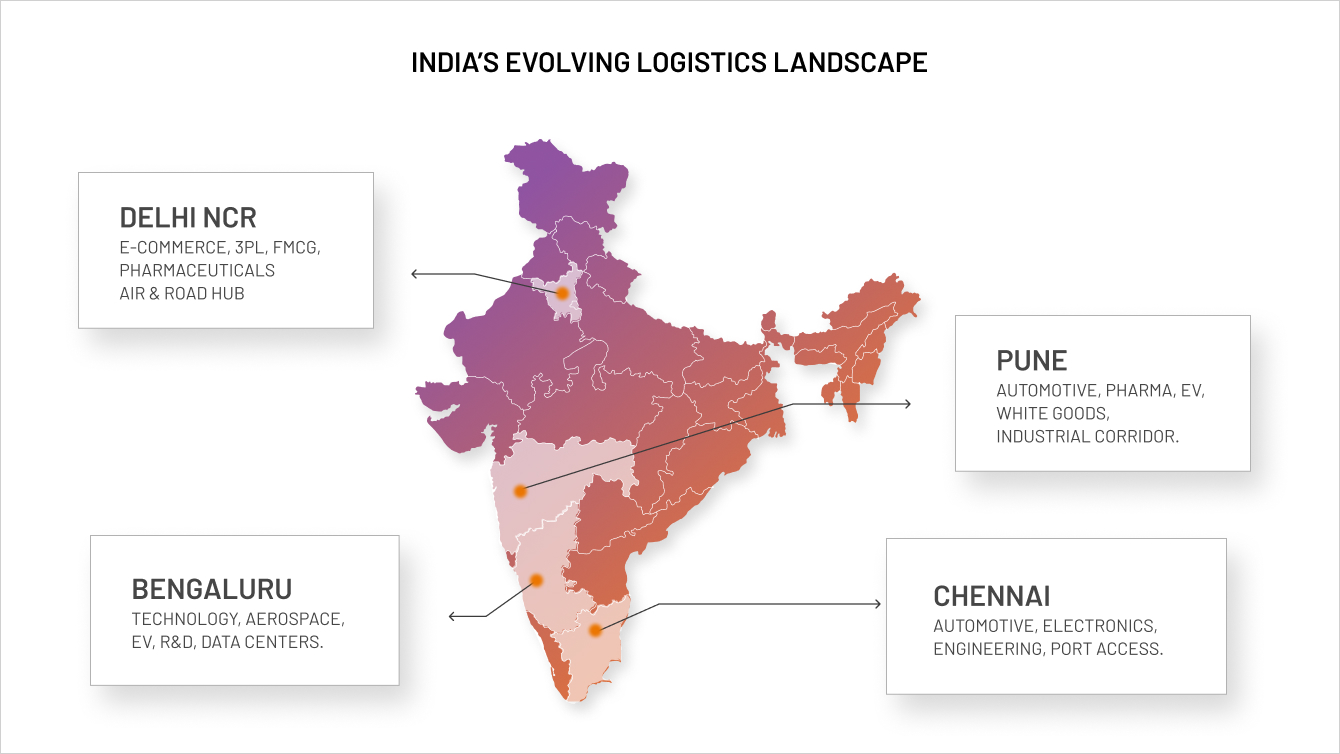 Pune is emerging as a hub for industrial growth, benefitting from closeness to Mumbai port facilities while offering more affordable land. The city and its access cum proximity to Industrial Corridors like Chakan MIDC makes it a stronghold for automotive, engineering goods, EV manufacturing, pharmaceuticals, and white goods production, all of which increasingly demand BTS facilities with automation readiness.