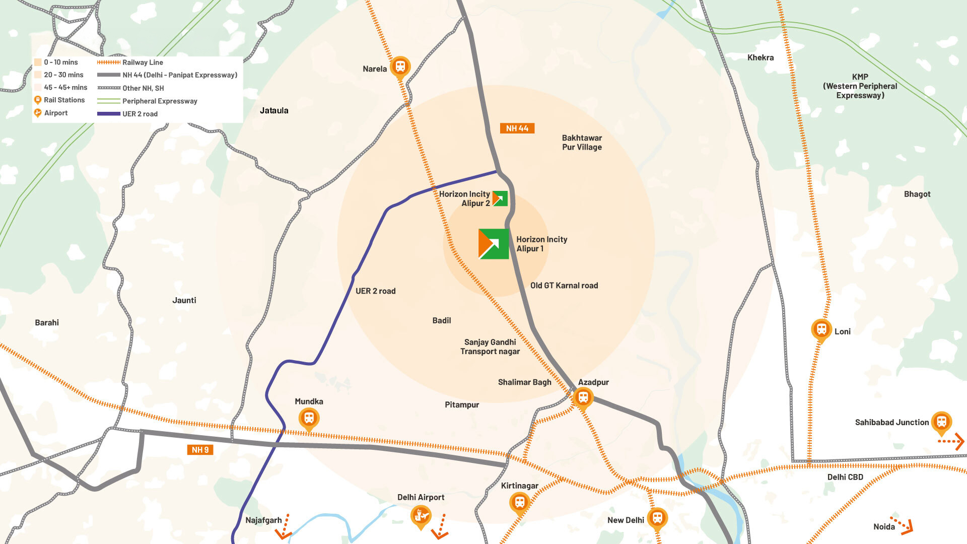 Direct connectivity to NH-44, KMP Expressway (19 km), and Samaypur Badli Metro (6 km).