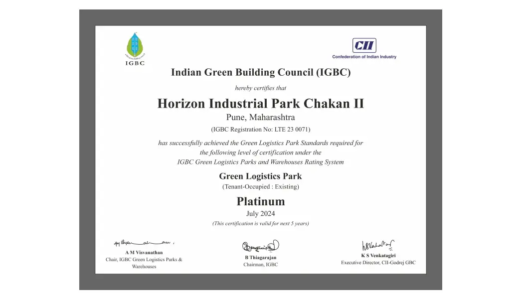 Horizon Industrial Park, Chakan II is strategically located in a suburb of Pune in Chakan’s MIDC Phase 2 with a fully developed physical infrastructure, which is also Platinum green rated by IGBC, and offering Built-to-Suit blocks to our clients tailored to their specific requirements. The development of MIDC Phase 5 indicates growing demand for industrial/warehouse development.