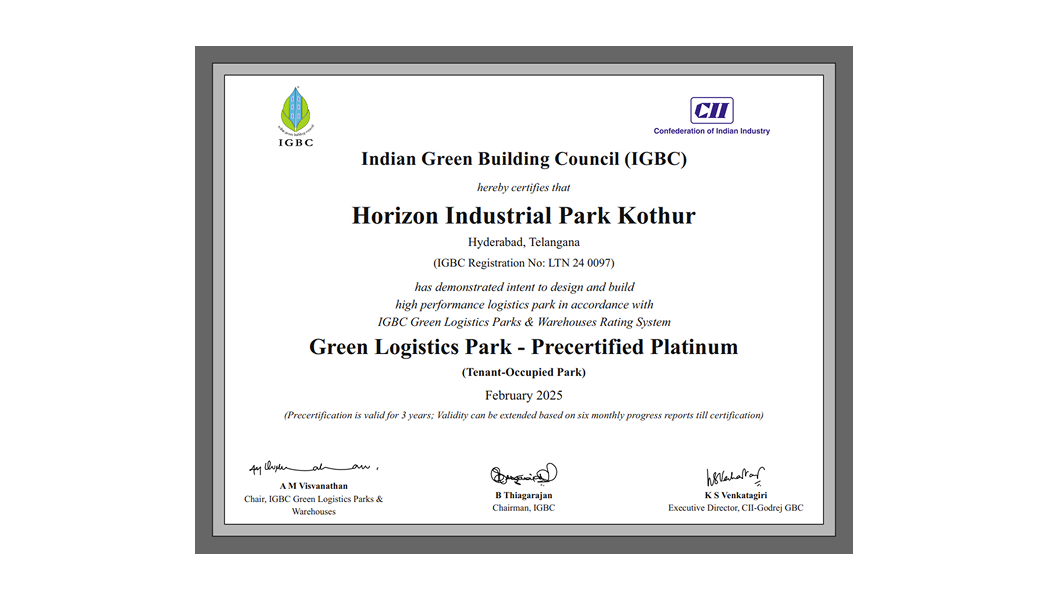 JCK Horizon Industrial Park Kothur is located near Hyderabad, and is ideal for manufacturing, E-commerce and 3PL activities. It is within the developed TGIIC industrial area of Kothur, and off the National Highway 44 (Hyderabad -Bengaluru Highway), with easy access to the international airport. This park has been platinum pre-certified by IGBC.