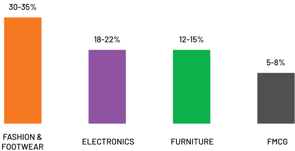 - Fashion returns touch 30-35%, electronics 20%, and COD rejections nearly 26%.